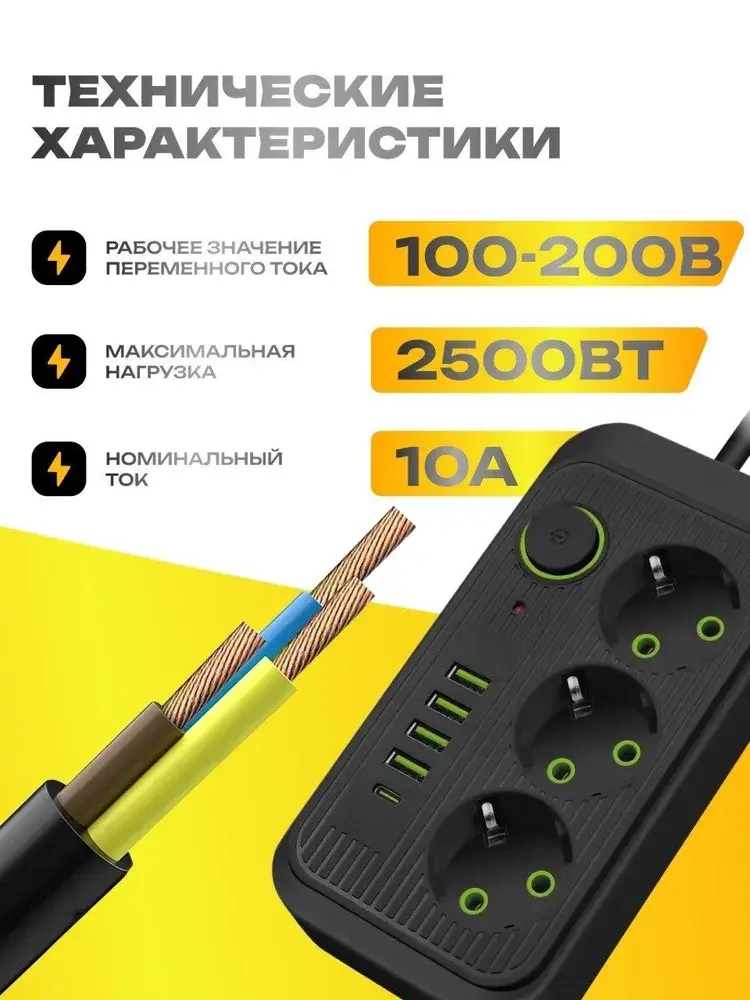 Удлинитель с 3 EURO розетками, 4 USB портами и type-C портом. Длина шнура 3 м. Удлинитель сетевой предназначен для бытового использования, для питания ПК, ноутбука, смартфона, бытовых кухонных приборов. Тройник имеет пониженный нагрев, высокий уровень безопасности. Технические характеристики розетки: Номинальный ток сетевого фильтра с предохранителем: 10 А. Номинальное напряжение фильтр сетевой: 250 В. Номинальная мощность удлинителя: 2500 Вт. Выход USB: 5В 2.1 А (Auto Max) Вход 250В - 50Hz 200мА. Материал корпуса: пластик АВС. Пожаробезопасный корпус. Удобен для ускоренной зарядки смартфонов, телефонов, фонарей и др. электротехники. Сетевой фильтр с предохранителем пригодится для зарядки современных электроприборов с универсальным штекером type c. Имеет внешнюю фактуру материала с узором под карбон, usb удлинитель смотрится модно и современно. Тройник с выключателем имеет возможность выключения питания нажатием на кнопку. Это отличный помощником дома в быту, квартире, на кухне, спальне, детской комнате, на работе в офисе, при ремонте и строительстве.