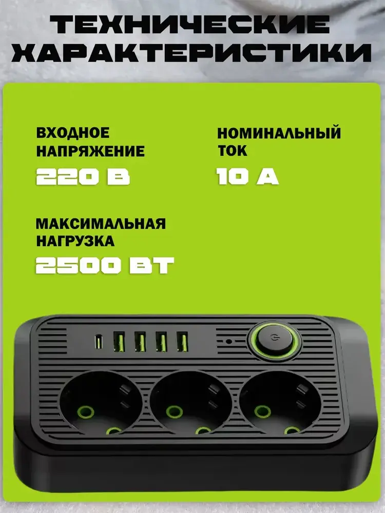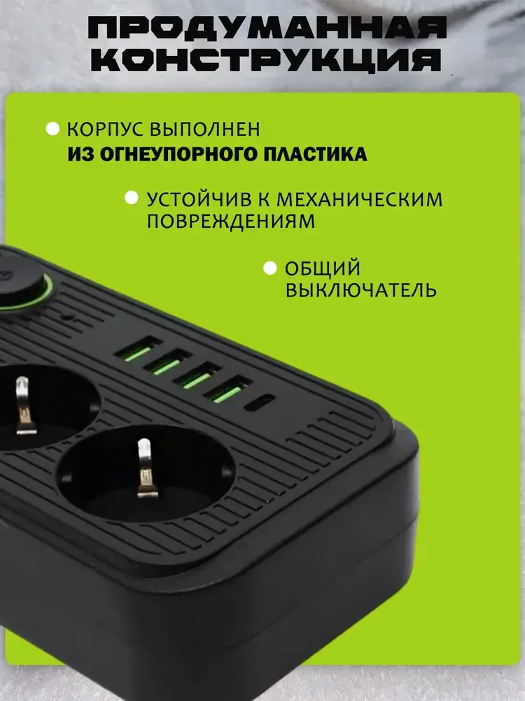 Удлинитель сетевой фильтр это мобильный вариант электророзетки с встроенной защитой от перегревания или короткого замыкания. Длина шнура пилота 2 метра. Тройник включает в себя 3 евро розетки для подключения различных устройств, а также 4 USB порта и Type-C порт. Этот мощный удлинитель имеет пониженный нагрев, высокий уровень безопасности. Верхняя огнестойкость корпуса сетевого фильтра с предохранителем ПК и АБС. Благодаря компактному размеру, удлинитель сетевой легко разместить на столе или повесить на стену, и сделать доступным для подключения необходимых устройств. Основные характеристики: • Ток 10А • Напряжение: 220 В • Мощность: 2500 Вт • Количество розеток: 3 шт. • USB порт: 4 шт • 4 USBх2.1А • Type-C порт: 1 шт • Длина кабеля: 2 метра • Защита от перепадов напряжения • Крепление на стену как вертикально, так и горизонтально • Цвет аксессуара: черный -1-u/ww1200/7449755394.jpg