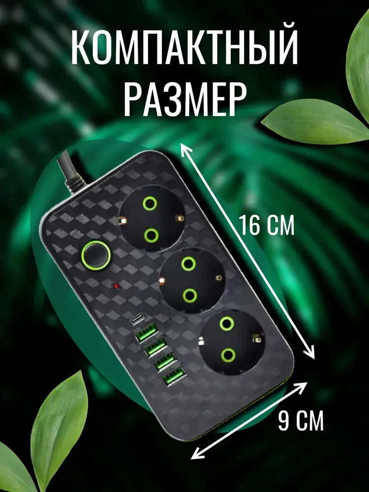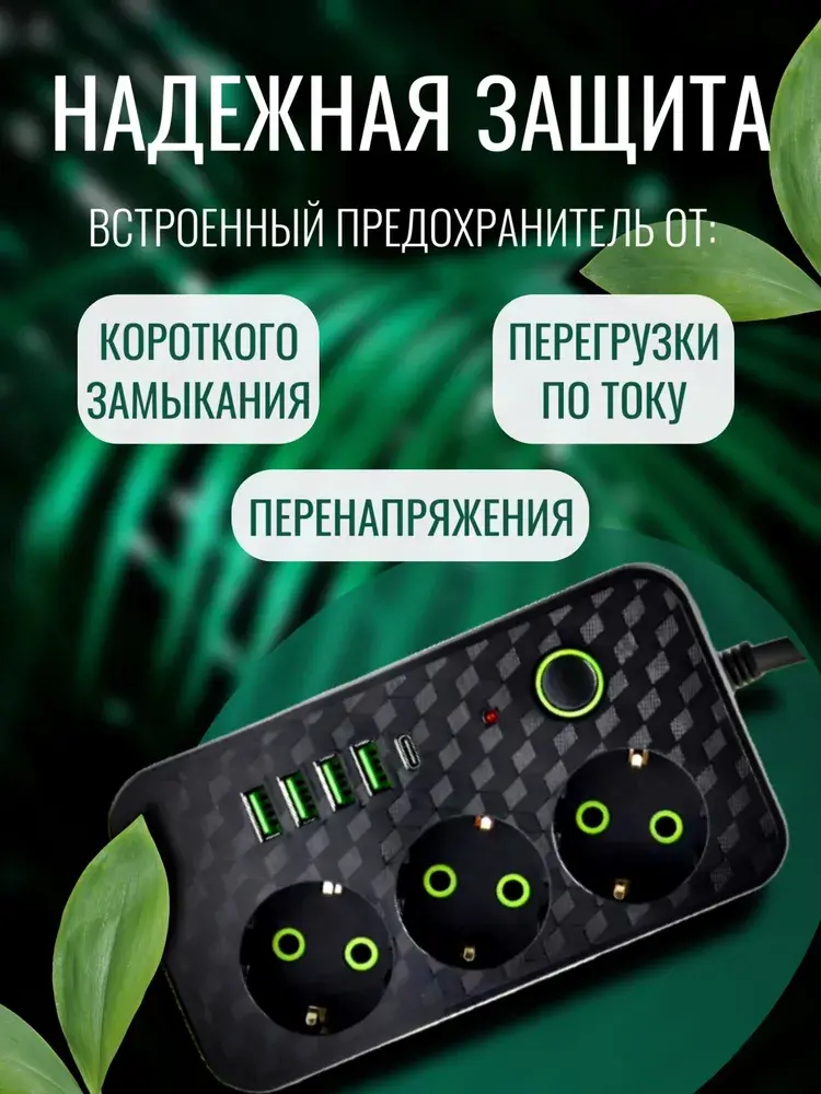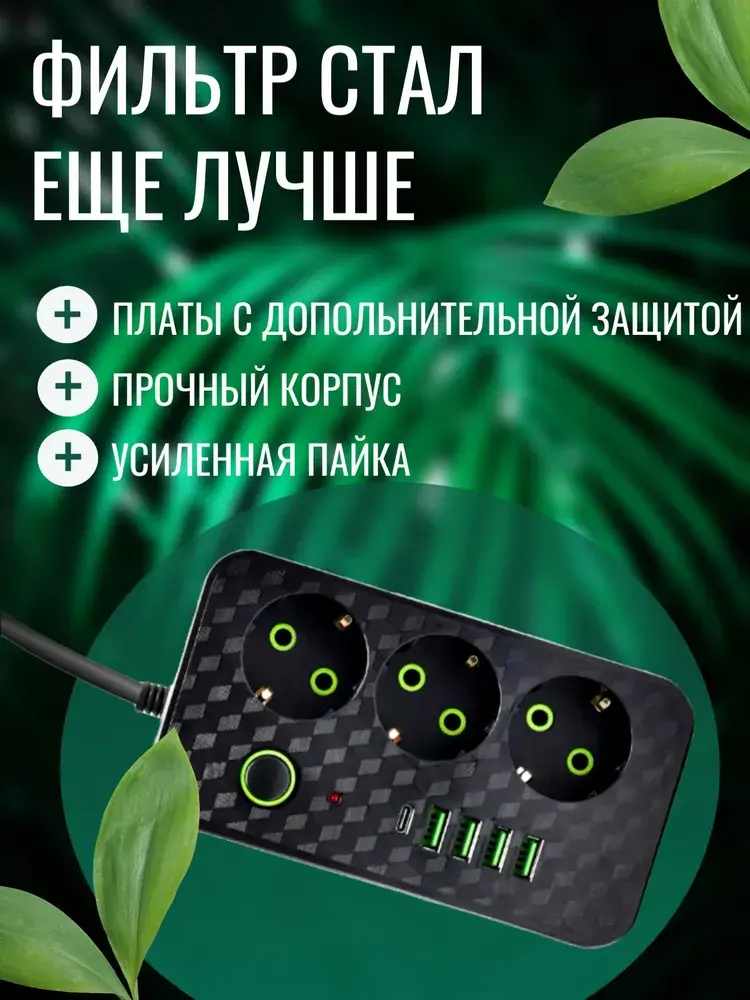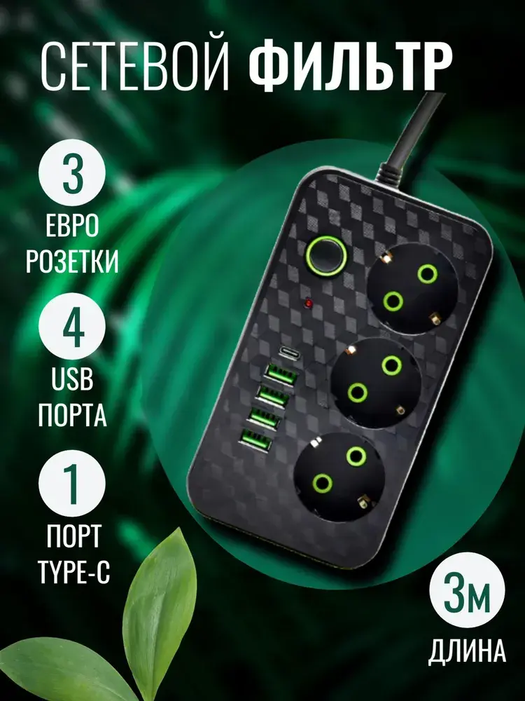 Сетевой фильтр 3м Сетевой фильтр (удлинитель сетевой) представляет собой удобное устройство, которое позволяет подключать несколько устройств к одной розетке. Этот пилот удлинитель оснащен 3 розетками и 4 USB-портами, а также одним портом Type-C, что обеспечивает возможность подключения различных электронных устройств, можно использовать как фильтр для компьютера, а также хорошо подойдет как удлинитель для гирлянды, поэтому он является многофункциональным. Длина разветвителя электрического составляет 3 метра, что позволяет свободно располагать подключенные устройства в нужном месте. Важным преимуществом розетки с выключателем является наличие заземления, которое обеспечивает безопасность и защиту от перегрузок. Тройник с usb 3.0 обладает многофункциональностью, позволяя подключать не только электрические приборы, но и заряжать устройства с помощью USB-портов. Благодаря разнообразию ключевых слов, данный продукт может использоваться как тройник розетка, разветвитель электрический, розетка с выключателем, тройник с USB, удлинитель с USB 3.0 и многое другое. Черный цвет разветвителя с type c придает ему стильный и современный вид, а прочный корпус обеспечивает долговечность и надежность использования. Этот удлинитель силовой идеально подходит для использования дома или в офисе, где требуется подключение и зарядка сразу нескольких устройств. Идеально подойдет для использования дома, гаража, склада, офиса. НЕ ПОДХОДИТ: для подключения тепловых пушек, радиаторов, сварочных аппаратов, компрессоров и другого строительного оборудования Показать полностью -1-0/ww1200/7447646808.jpg