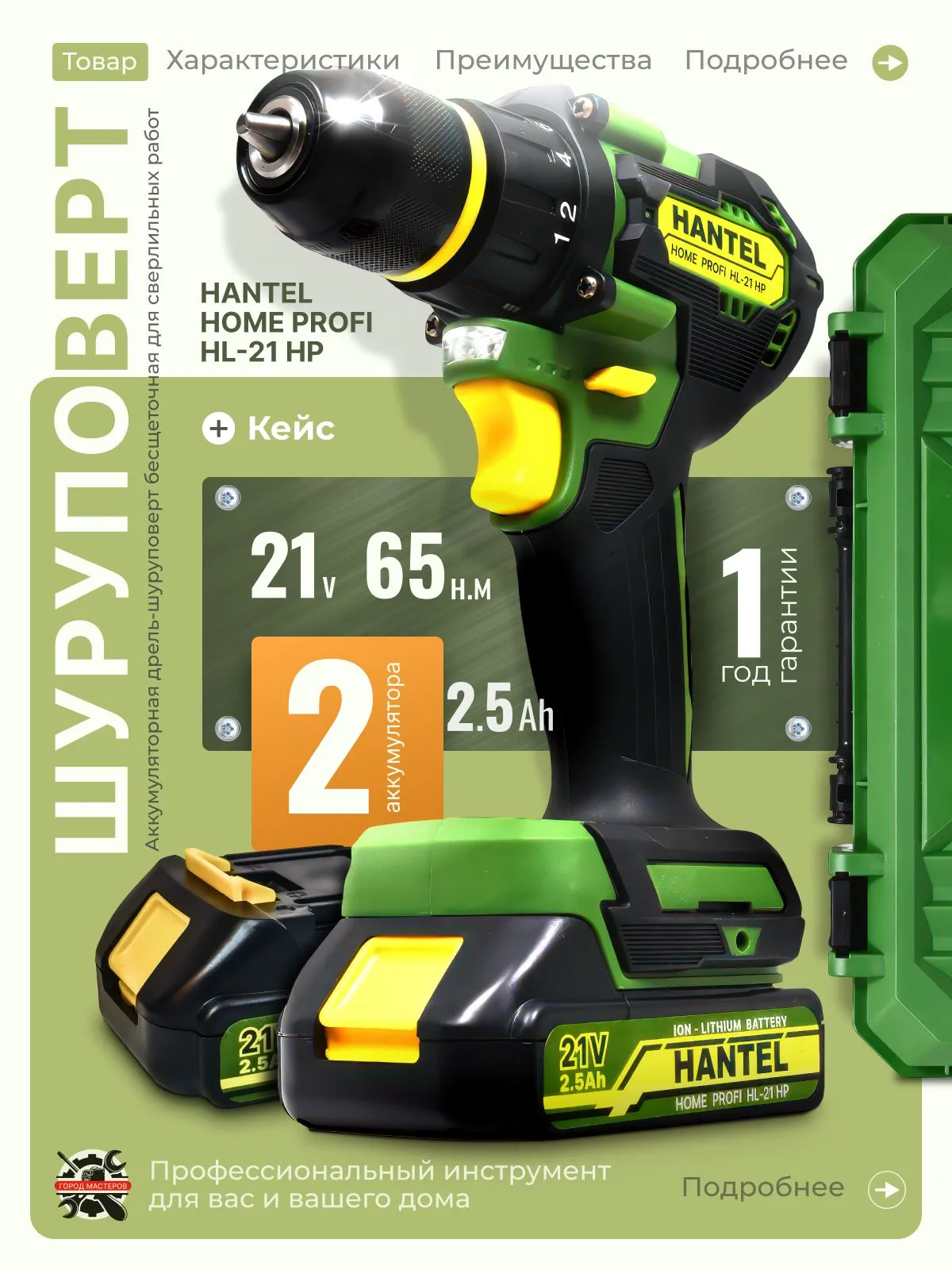 Дрель-шуруповерт аккумуляторная бесщеточная HANTEL HL-21 HP