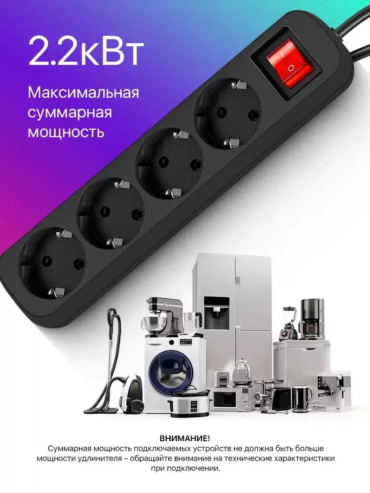 Простой и надежный бытовой удлинитель, который предназначен для электроприборов и использования внутри помещений. Подходит для дома, офиса и коммерческих помещений. - Предусмотрена возможность крепления на стену; - Длина провода 5 метров; - Мощность 2200 Вт; - Максимальный допустимый ток 10А; - Корпус из негорючего пластика; - Индикатор сети; - Выключатель питания.