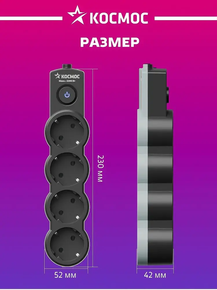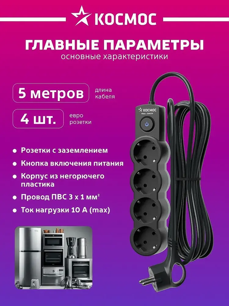 Бытовой удлинитель на 4 гнезда, длина шнура 5м. Диаметр сечения провода - 3*0,75мм². Тип провода - ПВС, номинальный ток 10А, максимальная мощность - 2200Вт. С заземлением и выключателем. Надежный корпус и контактная группа из латуни не деформируется на протяжении всего срока службы. Все гнезда с защитными шторками