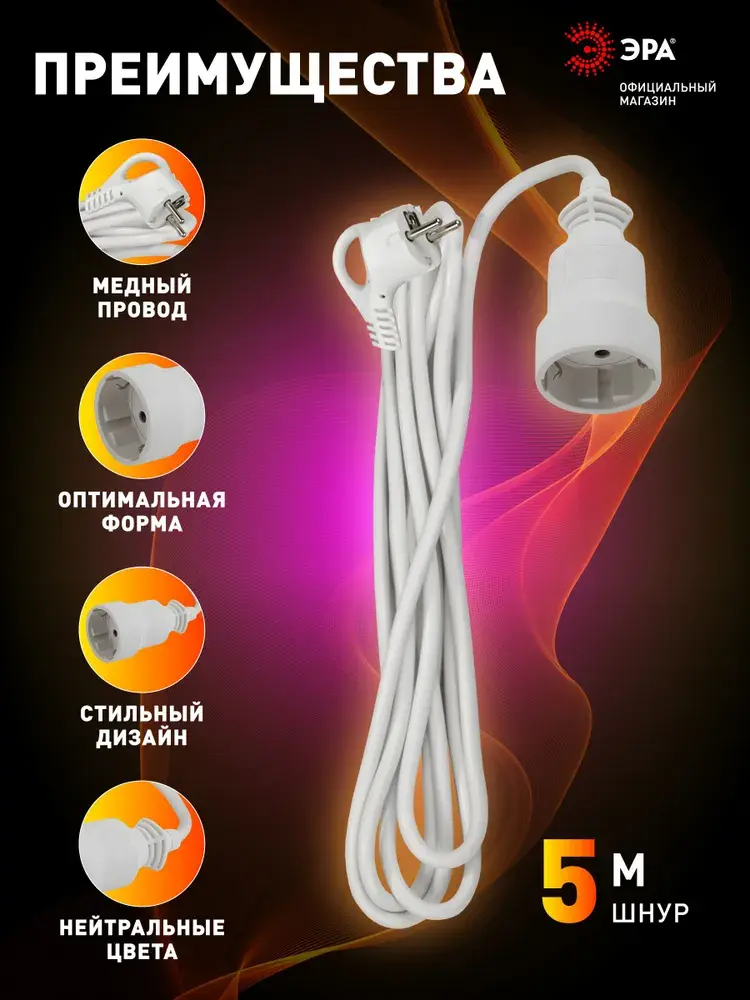 Надёжный удлинитель российского производства с длинным шнуром. Позволяет подключать электроприбор к сети на расстоянии 5 метров от розетки. С заземлением. В составе корпуса негорючие антипирены, этот удлинитель безопасен в использовании. Надёжный трёхжильный провод, удобная вилка с кольцом. Подходит для применения с мощными бытовыми приборами с максимальной нагрузкой 10 А/ 2200 Вт.