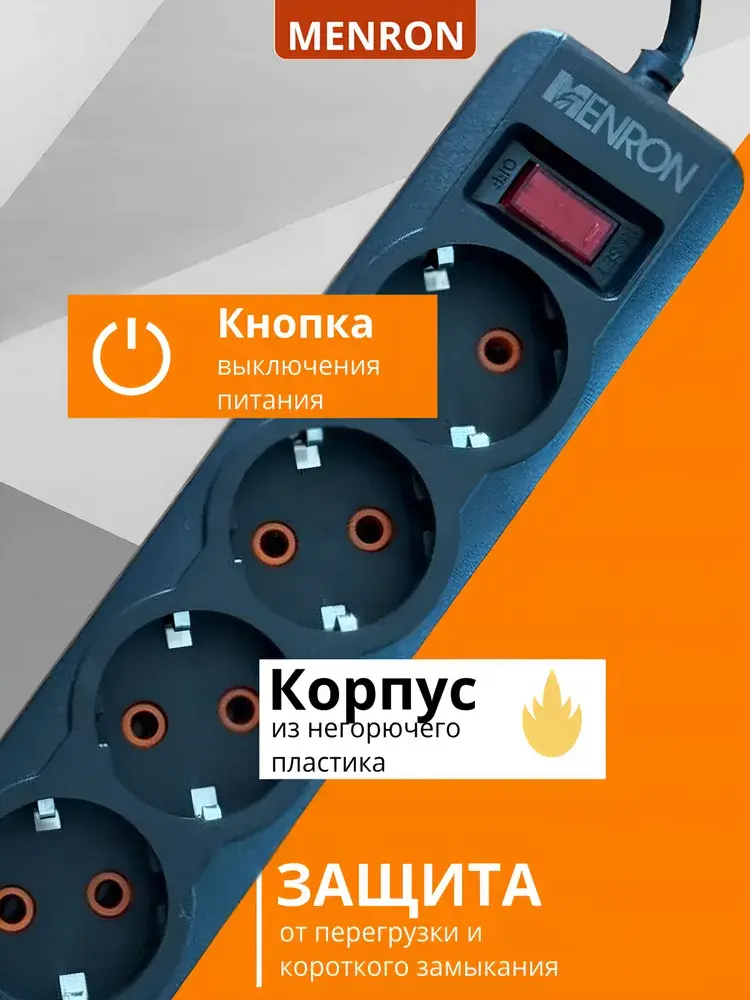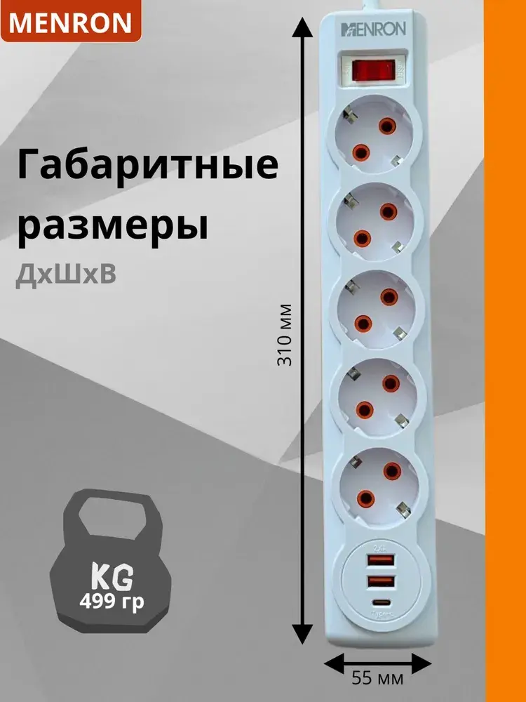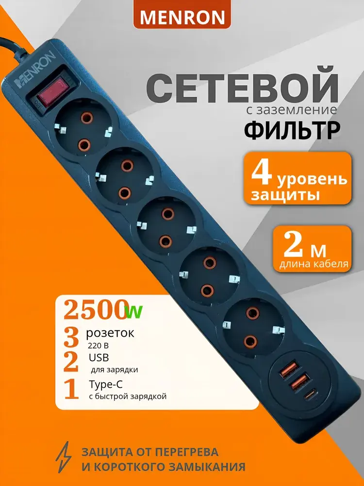 Сетевой фильтр MENRON ME804 — 5 розеток с заземлением, 2 USB, 1 Type-C, 2500 Вт Ищете сетевой фильтр с USB и Type-C для дома или офиса? MENRON ME804 — это многофункциональный удлинитель с защитой от перегрузки, который позволяет безопасно подключить до 5 электроприборов и одновременно заряжать устройства через USB. ✅ Преимущества: 5 розеток с заземлением — удобно подключать технику, ноутбук, телевизор и зарядные блоки 2 USB + 1 Type-C порт — быстрая зарядка смартфонов, планшетов, наушников и других гаджетов Сетевой фильтр 2500 Вт — выдерживает подключение мощных бытовых приборов Выключатель с подсветкой — удобно использовать в темноте Защита от перегрузки и короткого замыкания — безопасность ваших устройств в приоритете 📋 Технические характеристики: Тип: сетевой фильтр (удлинитель) Количество розеток: 5 Порты зарядки: 2 × USB (5V/2.1A), 1 × Type-C Максимальная нагрузка: 2500 Вт Материал: огнестойкий ABS-пластик Защита: от перегрузки, перенапряжения Длина провода: 1.8 м (уточняйте при покупке) Цвет: черный Назначение: удлинитель для дома, офиса, компьютера, ТВ, зарядки сетевой фильтр с usb удлинитель с type-c сетевой фильтр с usb портами и type-c удлинитель 5 розеток с заземлением пилот с выключателем розетка с usb type-c удлинитель с защитой от перегрузки фильтр для зарядки телефонов и планшетов удлинитель с кнопкой и подсветкой MENRON ME804 — универсальный и безопасный сетевой фильтр с USB и Type-C портами для любых задач. Подходит как для дома, так и для рабочего места.