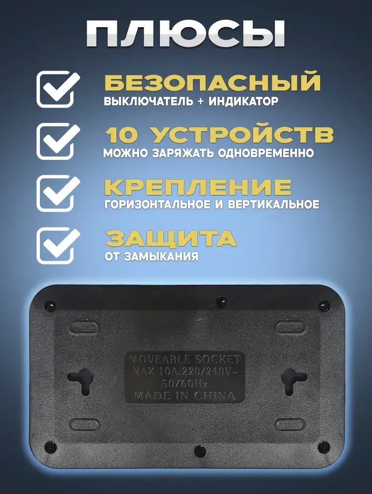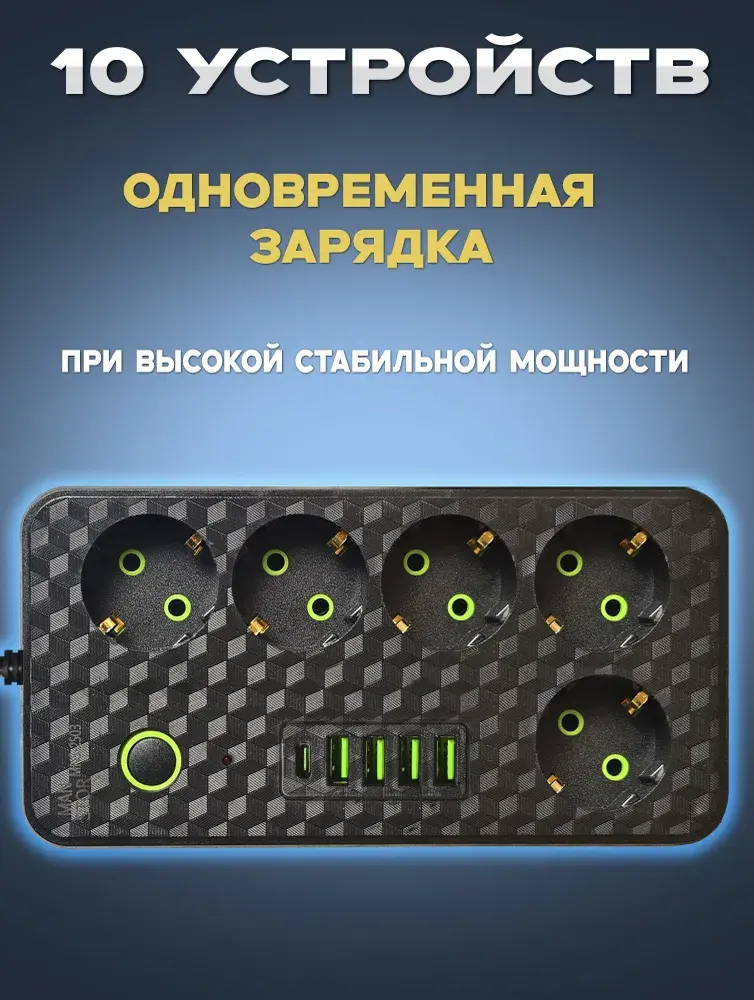 Данный сетевой удлинитель обеспечивает надежное подключение различных устройств одновременно благодаря наличию пяти розеток. Intellicharge позволяет эффективно заряжать современные гаджеты через четыре стандартных USB-порта и один разъем Type-C. Подойдет для использования как в офисе, так и дома. Благодаря надежной изоляции из пожаробезопасного пластика ABC гарантирует безопасную эксплуатацию даже при длительной нагрузке. Подходит для подключения энергоемких приборов мощностью до 2500 Вт.Удлинитель сетевой имеет пониженный нагрев, высокий уровень безопасности. Интеллектуальная технология Super Charge быстрой зарядки через USB. Технические характеристики удлинителя : Ток: 10 А Напряжение: 250 В Мощность удлинителя пилота: 2500 Вт USB-порт: 4 шт Выход USB: 5 В, 2.4 А (Auto Max) TYPE-C порт-1 шт Материал корпуса: пластик АВС Пожаробезопасный корпус барьер блок Количество розеток: 5 шт Длина провода: 3 м Цвет аксессуара: черный.