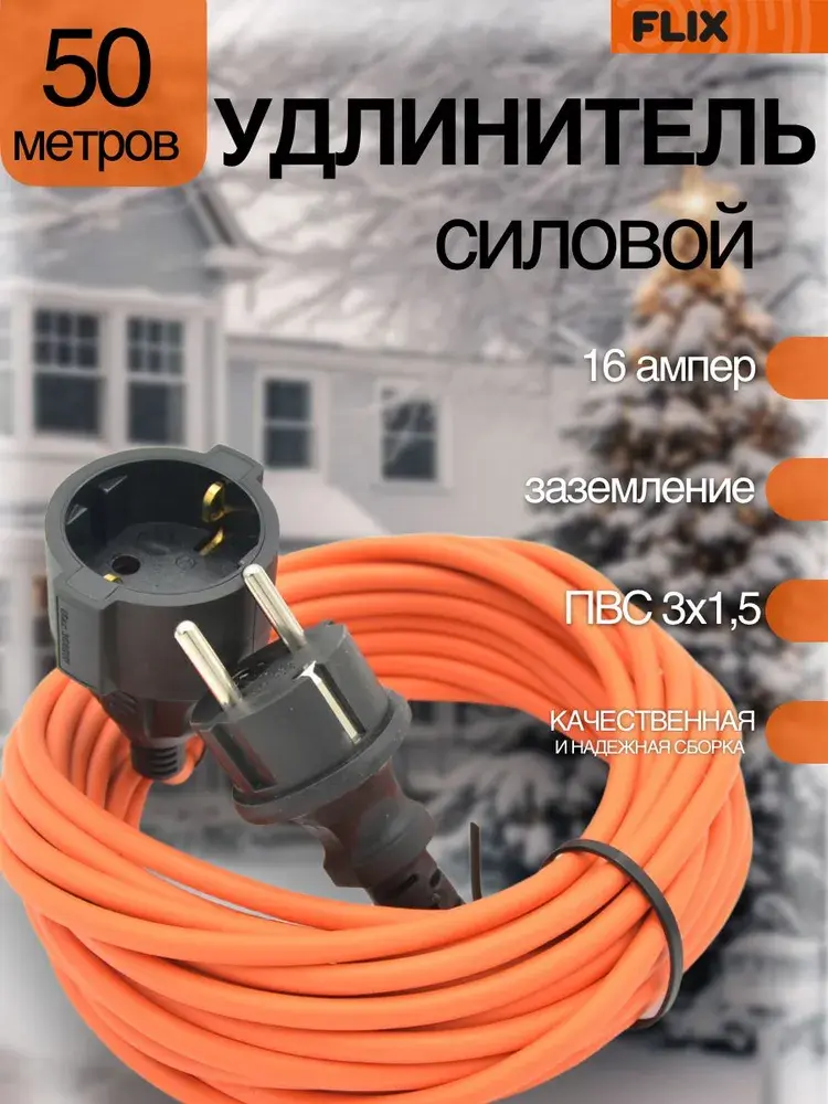 Удлинитель Flix Удлинитель Flix производится в России, проходя все этапы изготовления. Сборка осуществляется на Орловском заводе PILOT, а кабель — на Орловском Кабельном Заводе (ОКЗ). Качество продукции обеспечивается многоуровневым контролем, а также тщательными испытаниями на соответствие стандартам. В процессе производства используются самые современные производственные линии, что позволяет создавать качественные и надежные удлинители. Силовой удлинитель 50 метров Силовой удлинитель – идеальное решение для строительства, ремонта и других работ, где важно свободное перемещение и доступ к электричеству. Ключевые особенности: ✔ Длина 50 метров – обеспечивает свободу передвижения на больших площадях (стройплощадки, дачи, мастерские). ✔ Качественный кабель ПВСбм 3×1,5 мм² – прочный, гибкий и устойчивый к износу, соответствует ГОСТу ✔ Мощность до 3520 Вт (16А) – подходит для электроинструментов (дрели, болгарки, циркулярные пилы) и бытовой техники. ✔ Наличие заземления – безопасность при работе с мощными устройствами. ✔ Универсальность – можно использовать в помещении и на улице (при защите от влаги). Преимущества: 🔹 Прочность и долговечность – выдерживает интенсивные нагрузки. 🔹 Безопасность – соответствует стандартам качества и защиты. 🔹 Удобство – компактная смотка, удобная переноска. Идеален для: 🔧 Строительных работ 🏡 Дачи и гаража 🛠 Ремонта и монтажа 🔌 Подключения электроинструментов Розетка силового удлинителя Ключевые особенности розетки: ✔ Материал корпуса – ударопрочный пластик, устойчивый к механическим повреждениям и нагреву. ✔ Конструкция – компактная, с защитными шторками, предотвращающими случайное попадание посторонних предметов. ✔ Заземляющий контакт – обеспечивает безопасность при работе с мощной техникой. ✔ Плотный прижим вилки – исключает искрение и перегрев при нагрузке до 16А / 3520 Вт. ✔ Удобное расположение – оптимальный угол подключения, не мешает передвижению. Преимущества розетки: 🔹 Универсальность – подходит для всех стандартных вилок 🔹 Надежность контактов – медные элементы обеспечивают стабильное соединение. 🔌 Электроинструментов (дрели, перфораторы, болгарки) 🔌 Садовой техники (газонокосилки, триммеры) 🔌 Бытовых приборов (обогреватели, компрессоры) Вилка силового удлинителя Ключевые особенности вилки: ✔ Корпус из ударопрочного пластика – устойчив к механическим повреждениям, не трескается при падениях и ударах. ✔ Мощные контакты – обеспечивают минимальное сопротивление и отсутствие перегрева при нагрузке до 16А / 3520 Вт. ✔ Заземляющий контакт – дополнительная защита при работе с мощной техникой. ✔ Эргономичная форма – удобно держать в руке, легко вставлять и вынимать из розетки. ✔ Усиленное крепление кабеля – защита от перегибов и повреждения провода в месте соединения. Преимущества вилки: 🔹 Совместимость – стандартная евровилка (тип F или CEE 7/4) подходит для большинства розеток. 🔹 Долговечность – износостойкие материалы и надежная сборка. Идеально подходит для: ⚡ Подключения к промышленным и бытовым розеткам ⚡ Работы с мощными электроинструментами ⚡ Использования в сложных условиях (стройка, мастерская, улица) Показать полностью -1-4/ww1200/7459425472.jpg -1-6/ww1200/7453663854.jpg -1-g/ww1200/7453663756.jpg -1-l/ww1200/7453663761.jpg